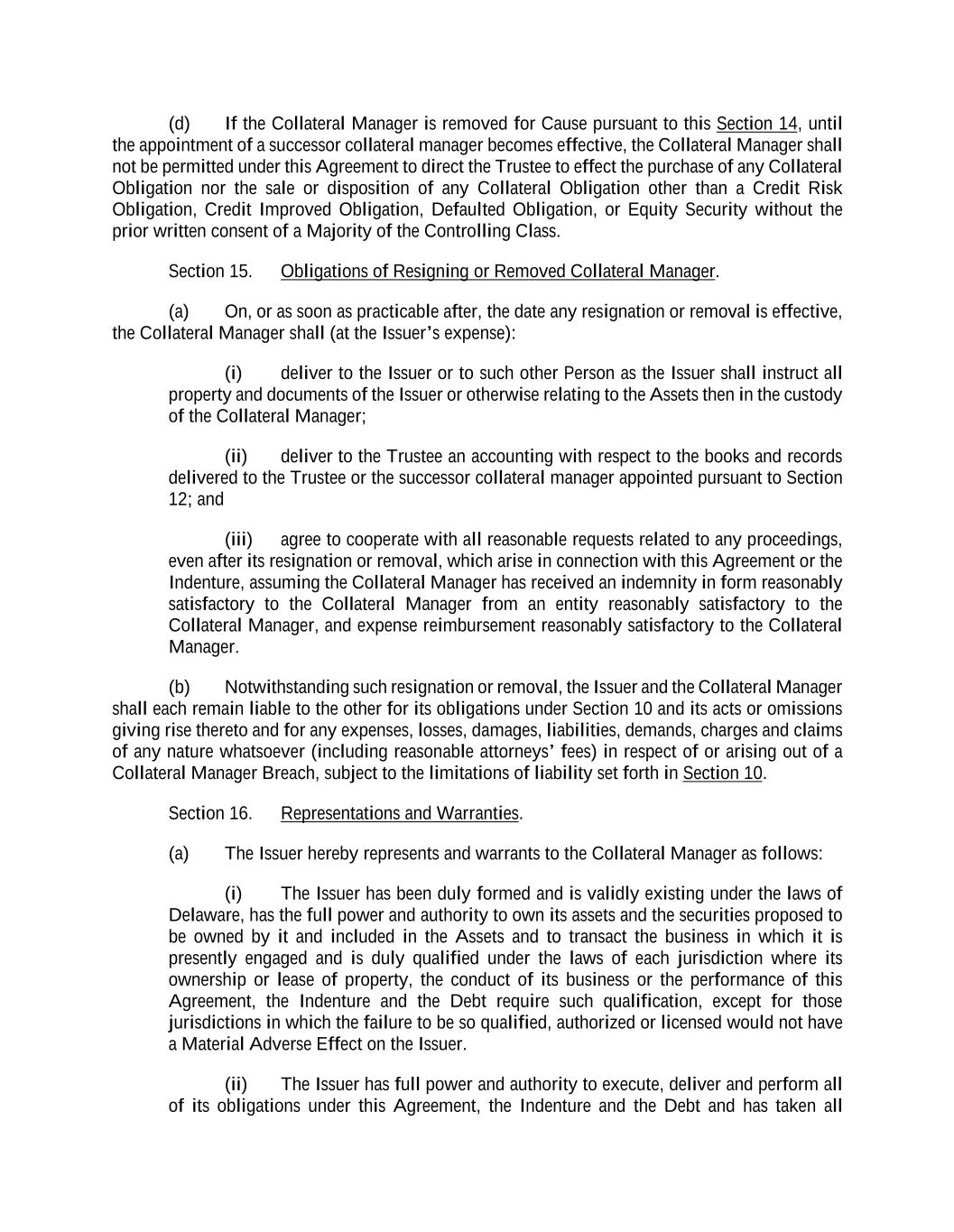 (d) If the Collateral Manager is removed for Cause pursuant to this Section 14, until the appointment of a successor collateral manager becomes effective, the Collateral Manager shall not be permitted under this Agreement to direct the Trustee to effect the purchase of any Collateral Obligation nor the sale or disposition of any Collateral Obligation other than a Credit Risk Obligation, Credit Improved Obligation, Defaulted Obligation, or Equity Security without the prior written consent of a Majority of the Controlling Class. Section 15. Obligations of Resigning or Removed Collateral Manager. (a) On, or as soon as practicable after, the date any resignation or removal is effective, the Collateral Manager shall (at the Issuer’s expense): (i) deliver to the Issuer or to such other Person as the Issuer shall instruct all property and documents of the Issuer or otherwise relating to the Assets then in the custody of the Collateral Manager; (ii) deliver to the Trustee an accounting with respect to the books and records delivered to the Trustee or the successor collateral manager appointed pursuant to Section 12; and (iii) agree to cooperate with all reasonable requests related to any proceedings, even after its resignation or removal, which arise in connection with this Agreement or the Indenture, assuming the Collateral Manager has received an indemnity in form reasonably satisfactory to the Collateral Manager from an entity reasonably satisfactory to the Collateral Manager, and expense reimbursement reasonably satisfactory to the Collateral Manager. (b) Notwithstanding such resignation or removal, the Issuer and the Collateral Manager shall each remain liable to the other for its obligations under Section 10 and its acts or omissions giving rise thereto and for any expenses, losses, damages, liabilities, demands, charges and claims of any nature whatsoever (including reasonable attorneys’ fees) in respect of or arising out of a Collateral Manager Breach, subject to the limitations of liability set forth in Section 10. Section 16. Representations and Warranties. (a) The Issuer hereby represents and warrants to the Collateral Manager as follows: (i) The Issuer has been duly formed and is validly existing under the laws of Delaware, has the full power and authority to own its assets and the securities proposed to be owned by it and included in the Assets and to transact the business in which it is presently engaged and is duly qualified under the laws of each jurisdiction where its ownership or lease of property, the conduct of its business or the performance of this Agreement, the Indenture and the Debt require such qualification, except for those jurisdictions in which the failure to be so qualified, authorized or licensed would not have a Material Adverse Effect on the Issuer. (ii) The Issuer has full power and authority to execute, deliver and perform all of its obligations under this Agreement, the Indenture and the Debt and has taken all