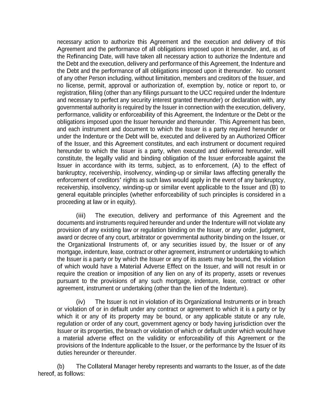 necessary action to authorize this Agreement and the execution and delivery of this Agreement and the performance of all obligations imposed upon it hereunder, and, as of the Refinancing Date, will have taken all necessary action to authorize the Indenture and the Debt and the execution, delivery and performance of this Agreement, the Indenture and the Debt and the performance of all obligations imposed upon it thereunder. No consent of any other Person including, without limitation, members and creditors of the Issuer, and no license, permit, approval or authorization of, exemption by, notice or report to, or registration, filing (other than any filings pursuant to the UCC required under the Indenture and necessary to perfect any security interest granted thereunder) or declaration with, any governmental authority is required by the Issuer in connection with the execution, delivery, performance, validity or enforceability of this Agreement, the Indenture or the Debt or the obligations imposed upon the Issuer hereunder and thereunder. This Agreement has been, and each instrument and document to which the Issuer is a party required hereunder or under the Indenture or the Debt will be, executed and delivered by an Authorized Officer of the Issuer, and this Agreement constitutes, and each instrument or document required hereunder to which the Issuer is a party, when executed and delivered hereunder, will constitute, the legally valid and binding obligation of the Issuer enforceable against the Issuer in accordance with its terms, subject, as to enforcement, (A) to the effect of bankruptcy, receivership, insolvency, winding-up or similar laws affecting generally the enforcement of creditors’ rights as such laws would apply in the event of any bankruptcy, receivership, insolvency, winding-up or similar event applicable to the Issuer and (B) to general equitable principles (whether enforceability of such principles is considered in a proceeding at law or in equity). (iii) The execution, delivery and performance of this Agreement and the documents and instruments required hereunder and under the Indenture will not violate any provision of any existing law or regulation binding on the Issuer, or any order, judgment, award or decree of any court, arbitrator or governmental authority binding on the Issuer, or the Organizational Instruments of, or any securities issued by, the Issuer or of any mortgage, indenture, lease, contract or other agreement, instrument or undertaking to which the Issuer is a party or by which the Issuer or any of its assets may be bound, the violation of which would have a Material Adverse Effect on the Issuer, and will not result in or require the creation or imposition of any lien on any of its property, assets or revenues pursuant to the provisions of any such mortgage, indenture, lease, contract or other agreement, instrument or undertaking (other than the lien of the Indenture). (iv) The Issuer is not in violation of its Organizational Instruments or in breach or violation of or in default under any contract or agreement to which it is a party or by which it or any of its property may be bound, or any applicable statute or any rule, regulation or order of any court, government agency or body having jurisdiction over the Issuer or its properties, the breach or violation of which or default under which would have a material adverse effect on the validity or enforceability of this Agreement or the provisions of the Indenture applicable to the Issuer, or the performance by the Issuer of its duties hereunder or thereunder. (b) The Collateral Manager hereby represents and warrants to the Issuer, as of the date hereof, as follows: