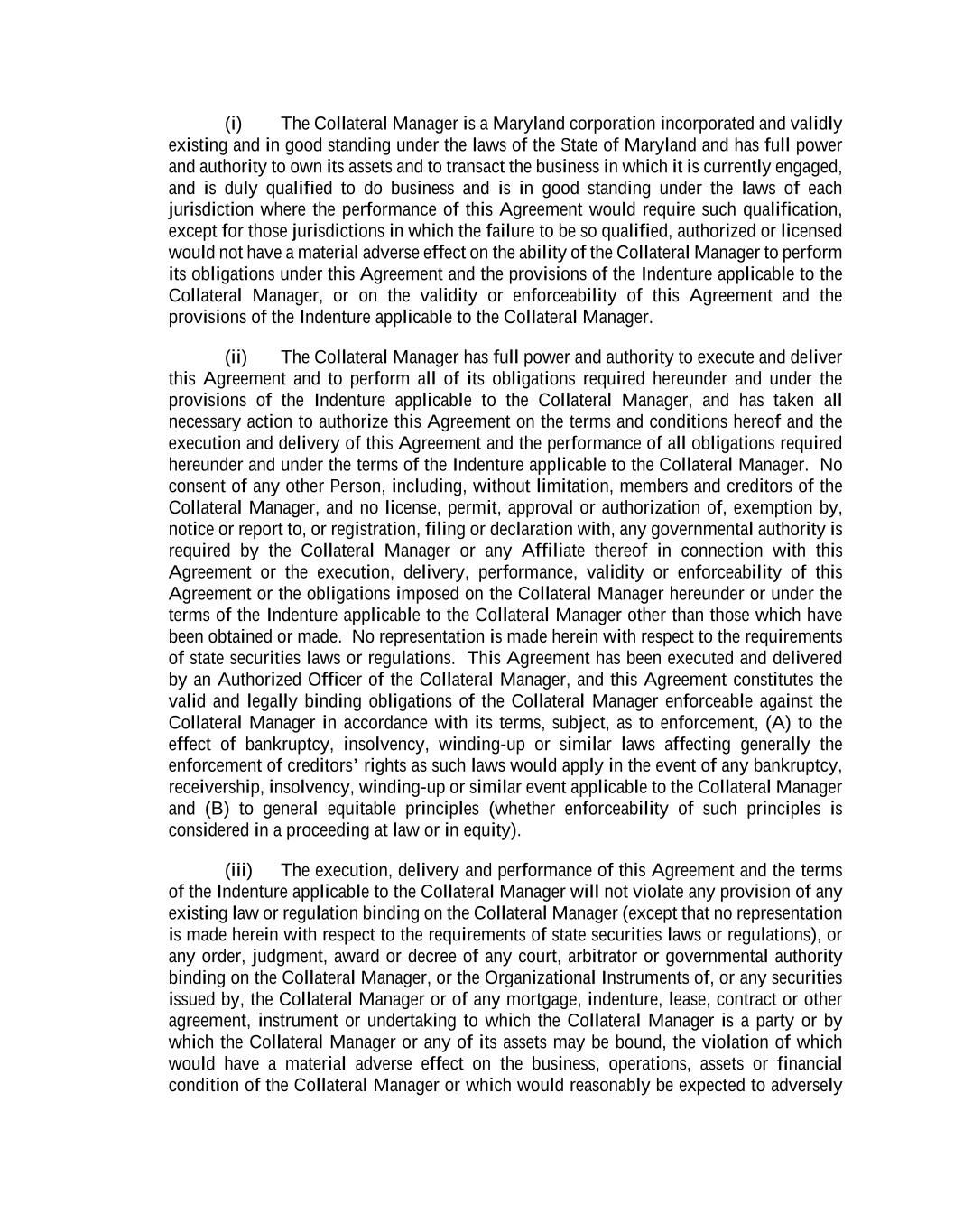 (i) The Collateral Manager is a Maryland corporation incorporated and validly existing and in good standing under the laws of the State of Maryland and has full power and authority to own its assets and to transact the business in which it is currently engaged, and is duly qualified to do business and is in good standing under the laws of each jurisdiction where the performance of this Agreement would require such qualification, except for those jurisdictions in which the failure to be so qualified, authorized or licensed would not have a material adverse effect on the ability of the Collateral Manager to perform its obligations under this Agreement and the provisions of the Indenture applicable to the Collateral Manager, or on the validity or enforceability of this Agreement and the provisions of the Indenture applicable to the Collateral Manager. (ii) The Collateral Manager has full power and authority to execute and deliver this Agreement and to perform all of its obligations required hereunder and under the provisions of the Indenture applicable to the Collateral Manager, and has taken all necessary action to authorize this Agreement on the terms and conditions hereof and the execution and delivery of this Agreement and the performance of all obligations required hereunder and under the terms of the Indenture applicable to the Collateral Manager. No consent of any other Person, including, without limitation, members and creditors of the Collateral Manager, and no license, permit, approval or authorization of, exemption by, notice or report to, or registration, filing or declaration with, any governmental authority is required by the Collateral Manager or any Affiliate thereof in connection with this Agreement or the execution, delivery, performance, validity or enforceability of this Agreement or the obligations imposed on the Collateral Manager hereunder or under the terms of the Indenture applicable to the Collateral Manager other than those which have been obtained or made. No representation is made herein with respect to the requirements of state securities laws or regulations. This Agreement has been executed and delivered by an Authorized Officer of the Collateral Manager, and this Agreement constitutes the valid and legally binding obligations of the Collateral Manager enforceable against the Collateral Manager in accordance with its terms, subject, as to enforcement, (A) to the effect of bankruptcy, insolvency, winding-up or similar laws affecting generally the enforcement of creditors’ rights as such laws would apply in the event of any bankruptcy, receivership, insolvency, winding-up or similar event applicable to the Collateral Manager and (B) to general equitable principles (whether enforceability of such principles is considered in a proceeding at law or in equity). (iii) The execution, delivery and performance of this Agreement and the terms of the Indenture applicable to the Collateral Manager will not violate any provision of any existing law or regulation binding on the Collateral Manager (except that no representation is made herein with respect to the requirements of state securities laws or regulations), or any order, judgment, award or decree of any court, arbitrator or governmental authority binding on the Collateral Manager, or the Organizational Instruments of, or any securities issued by, the Collateral Manager or of any mortgage, indenture, lease, contract or other agreement, instrument or undertaking to which the Collateral Manager is a party or by which the Collateral Manager or any of its assets may be bound, the violation of which would have a material adverse effect on the business, operations, assets or financial condition of the Collateral Manager or which would reasonably be expected to adversely