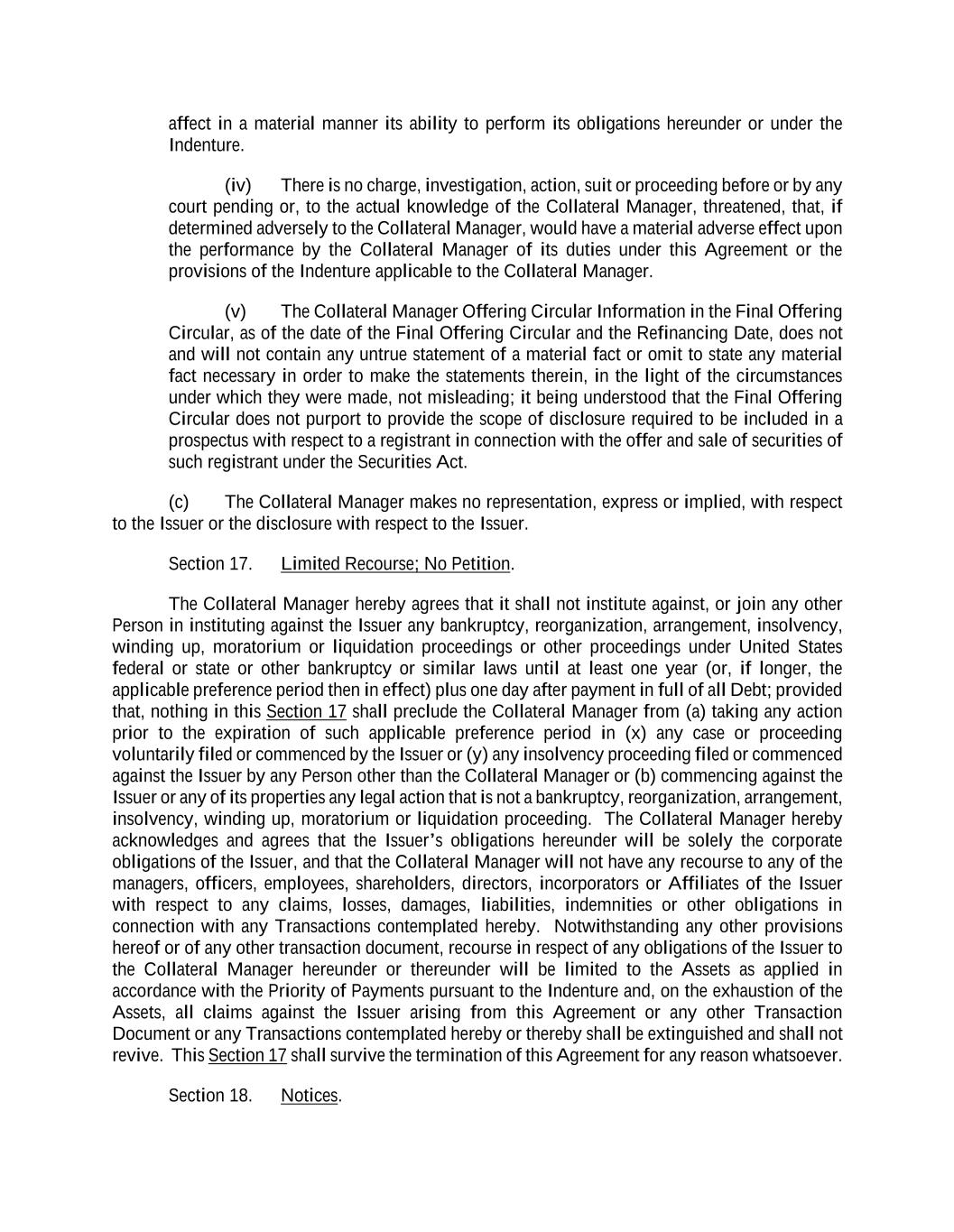 affect in a material manner its ability to perform its obligations hereunder or under the Indenture. (iv) There is no charge, investigation, action, suit or proceeding before or by any court pending or, to the actual knowledge of the Collateral Manager, threatened, that, if determined adversely to the Collateral Manager, would have a material adverse effect upon the performance by the Collateral Manager of its duties under this Agreement or the provisions of the Indenture applicable to the Collateral Manager. (v) The Collateral Manager Offering Circular Information in the Final Offering Circular, as of the date of the Final Offering Circular and the Refinancing Date, does not and will not contain any untrue statement of a material fact or omit to state any material fact necessary in order to make the statements therein, in the light of the circumstances under which they were made, not misleading; it being understood that the Final Offering Circular does not purport to provide the scope of disclosure required to be included in a prospectus with respect to a registrant in connection with the offer and sale of securities of such registrant under the Securities Act. (c) The Collateral Manager makes no representation, express or implied, with respect to the Issuer or the disclosure with respect to the Issuer. Section 17. Limited Recourse; No Petition. The Collateral Manager hereby agrees that it shall not institute against, or join any other Person in instituting against the Issuer any bankruptcy, reorganization, arrangement, insolvency, winding up, moratorium or liquidation proceedings or other proceedings under United States federal or state or other bankruptcy or similar laws until at least one year (or, if longer, the applicable preference period then in effect) plus one day after payment in full of all Debt; provided that, nothing in this Section 17 shall preclude the Collateral Manager from (a) taking any action prior to the expiration of such applicable preference period in (x) any case or proceeding voluntarily filed or commenced by the Issuer or (y) any insolvency proceeding filed or commenced against the Issuer by any Person other than the Collateral Manager or (b) commencing against the Issuer or any of its properties any legal action that is not a bankruptcy, reorganization, arrangement, insolvency, winding up, moratorium or liquidation proceeding. The Collateral Manager hereby acknowledges and agrees that the Issuer’s obligations hereunder will be solely the corporate obligations of the Issuer, and that the Collateral Manager will not have any recourse to any of the managers, officers, employees, shareholders, directors, incorporators or Affiliates of the Issuer with respect to any claims, losses, damages, liabilities, indemnities or other obligations in connection with any Transactions contemplated hereby. Notwithstanding any other provisions hereof or of any other transaction document, recourse in respect of any obligations of the Issuer to the Collateral Manager hereunder or thereunder will be limited to the Assets as applied in accordance with the Priority of Payments pursuant to the Indenture and, on the exhaustion of the Assets, all claims against the Issuer arising from this Agreement or any other Transaction Document or any Transactions contemplated hereby or thereby shall be extinguished and shall not revive. This Section 17 shall survive the termination of this Agreement for any reason whatsoever. Section 18. Notices.