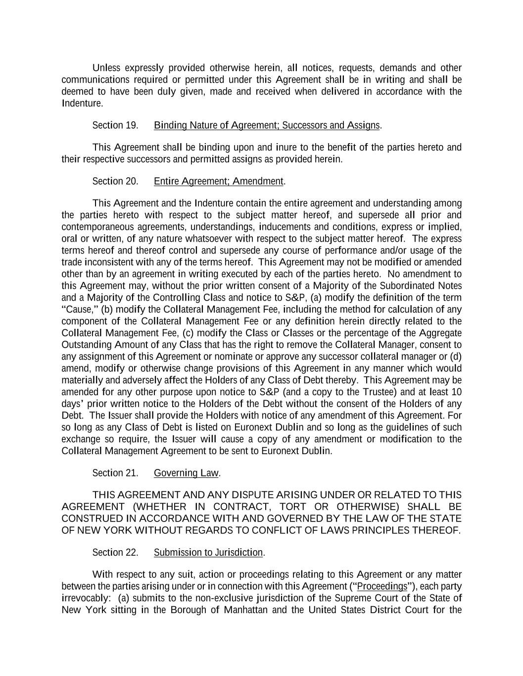 Unless expressly provided otherwise herein, all notices, requests, demands and other communications required or permitted under this Agreement shall be in writing and shall be deemed to have been duly given, made and received when delivered in accordance with the Indenture. Section 19. Binding Nature of Agreement; Successors and Assigns. This Agreement shall be binding upon and inure to the benefit of the parties hereto and their respective successors and permitted assigns as provided herein. Section 20. Entire Agreement; Amendment. This Agreement and the Indenture contain the entire agreement and understanding among the parties hereto with respect to the subject matter hereof, and supersede all prior and contemporaneous agreements, understandings, inducements and conditions, express or implied, oral or written, of any nature whatsoever with respect to the subject matter hereof. The express terms hereof and thereof control and supersede any course of performance and/or usage of the trade inconsistent with any of the terms hereof. This Agreement may not be modified or amended other than by an agreement in writing executed by each of the parties hereto. No amendment to this Agreement may, without the prior written consent of a Majority of the Subordinated Notes and a Majority of the Controlling Class and notice to S&P, (a) modify the definition of the term “Cause,” (b) modify the Collateral Management Fee, including the method for calculation of any component of the Collateral Management Fee or any definition herein directly related to the Collateral Management Fee, (c) modify the Class or Classes or the percentage of the Aggregate Outstanding Amount of any Class that has the right to remove the Collateral Manager, consent to any assignment of this Agreement or nominate or approve any successor collateral manager or (d) amend, modify or otherwise change provisions of this Agreement in any manner which would materially and adversely affect the Holders of any Class of Debt thereby. This Agreement may be amended for any other purpose upon notice to S&P (and a copy to the Trustee) and at least 10 days’ prior written notice to the Holders of the Debt without the consent of the Holders of any Debt. The Issuer shall provide the Holders with notice of any amendment of this Agreement. For so long as any Class of Debt is listed on Euronext Dublin and so long as the guidelines of such exchange so require, the Issuer will cause a copy of any amendment or modification to the Collateral Management Agreement to be sent to Euronext Dublin. Section 21. Governing Law. THIS AGREEMENT AND ANY DISPUTE ARISING UNDER OR RELATED TO THIS AGREEMENT (WHETHER IN CONTRACT, TORT OR OTHERWISE) SHALL BE CONSTRUED IN ACCORDANCE WITH AND GOVERNED BY THE LAW OF THE STATE OF NEW YORK WITHOUT REGARDS TO CONFLICT OF LAWS PRINCIPLES THEREOF. Section 22. Submission to Jurisdiction. With respect to any suit, action or proceedings relating to this Agreement or any matter between the parties arising under or in connection with this Agreement (“Proceedings”), each party irrevocably: (a) submits to the non-exclusive jurisdiction of the Supreme Court of the State of New York sitting in the Borough of Manhattan and the United States District Court for the