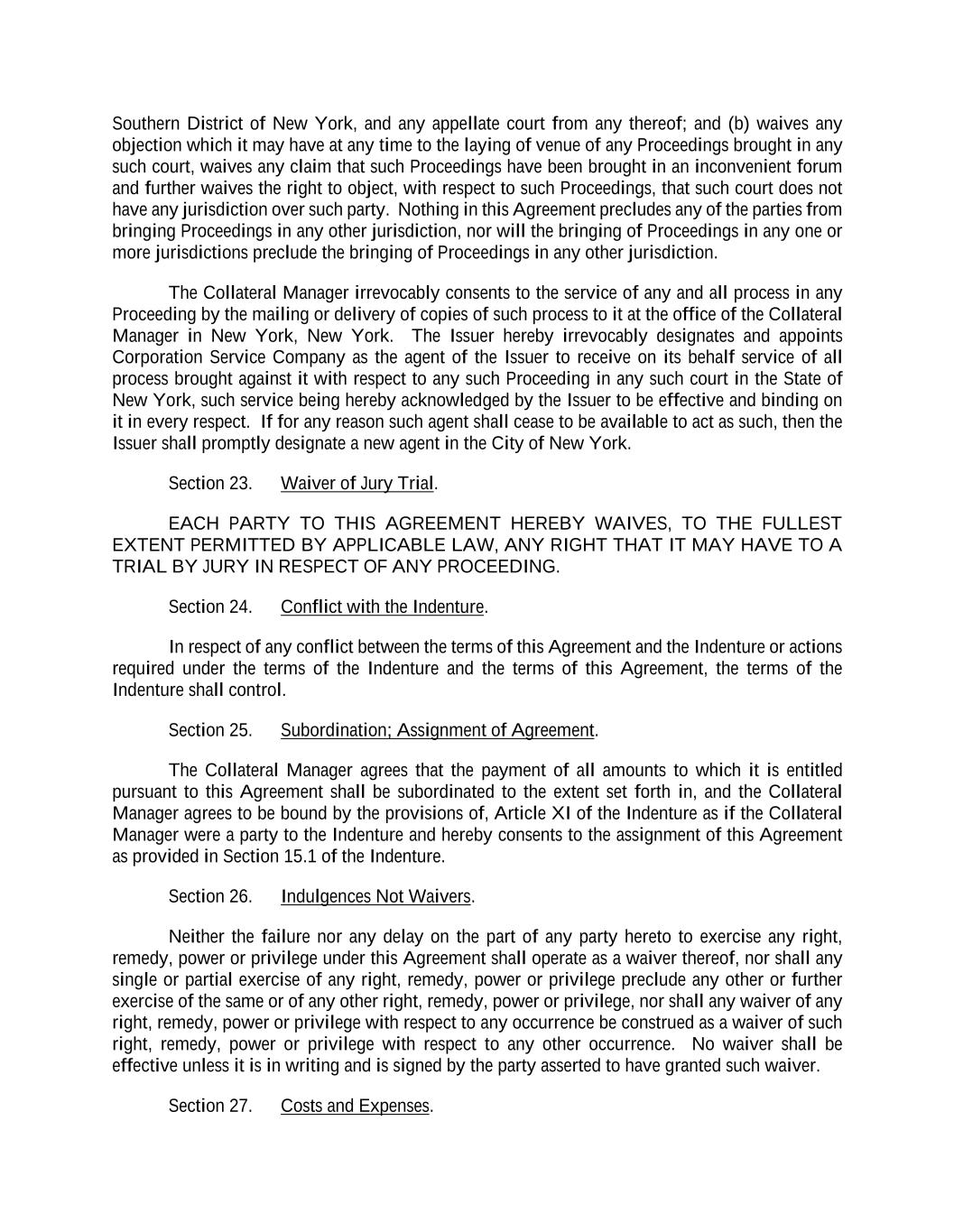 Southern District of New York, and any appellate court from any thereof; and (b) waives any objection which it may have at any time to the laying of venue of any Proceedings brought in any such court, waives any claim that such Proceedings have been brought in an inconvenient forum and further waives the right to object, with respect to such Proceedings, that such court does not have any jurisdiction over such party. Nothing in this Agreement precludes any of the parties from bringing Proceedings in any other jurisdiction, nor will the bringing of Proceedings in any one or more jurisdictions preclude the bringing of Proceedings in any other jurisdiction. The Collateral Manager irrevocably consents to the service of any and all process in any Proceeding by the mailing or delivery of copies of such process to it at the office of the Collateral Manager in New York, New York. The Issuer hereby irrevocably designates and appoints Corporation Service Company as the agent of the Issuer to receive on its behalf service of all process brought against it with respect to any such Proceeding in any such court in the State of New York, such service being hereby acknowledged by the Issuer to be effective and binding on it in every respect. If for any reason such agent shall cease to be available to act as such, then the Issuer shall promptly designate a new agent in the City of New York. Section 23. Waiver of Jury Trial. EACH PARTY TO THIS AGREEMENT HEREBY WAIVES, TO THE FULLEST EXTENT PERMITTED BY APPLICABLE LAW, ANY RIGHT THAT IT MAY HAVE TO A TRIAL BY JURY IN RESPECT OF ANY PROCEEDING. Section 24. Conflict with the Indenture. In respect of any conflict between the terms of this Agreement and the Indenture or actions required under the terms of the Indenture and the terms of this Agreement, the terms of the Indenture shall control. Section 25. Subordination; Assignment of Agreement. The Collateral Manager agrees that the payment of all amounts to which it is entitled pursuant to this Agreement shall be subordinated to the extent set forth in, and the Collateral Manager agrees to be bound by the provisions of, Article XI of the Indenture as if the Collateral Manager were a party to the Indenture and hereby consents to the assignment of this Agreement as provided in Section 15.1 of the Indenture. Section 26. Indulgences Not Waivers. Neither the failure nor any delay on the part of any party hereto to exercise any right, remedy, power or privilege under this Agreement shall operate as a waiver thereof, nor shall any single or partial exercise of any right, remedy, power or privilege preclude any other or further exercise of the same or of any other right, remedy, power or privilege, nor shall any waiver of any right, remedy, power or privilege with respect to any occurrence be construed as a waiver of such right, remedy, power or privilege with respect to any other occurrence. No waiver shall be effective unless it is in writing and is signed by the party asserted to have granted such waiver. Section 27. Costs and Expenses.