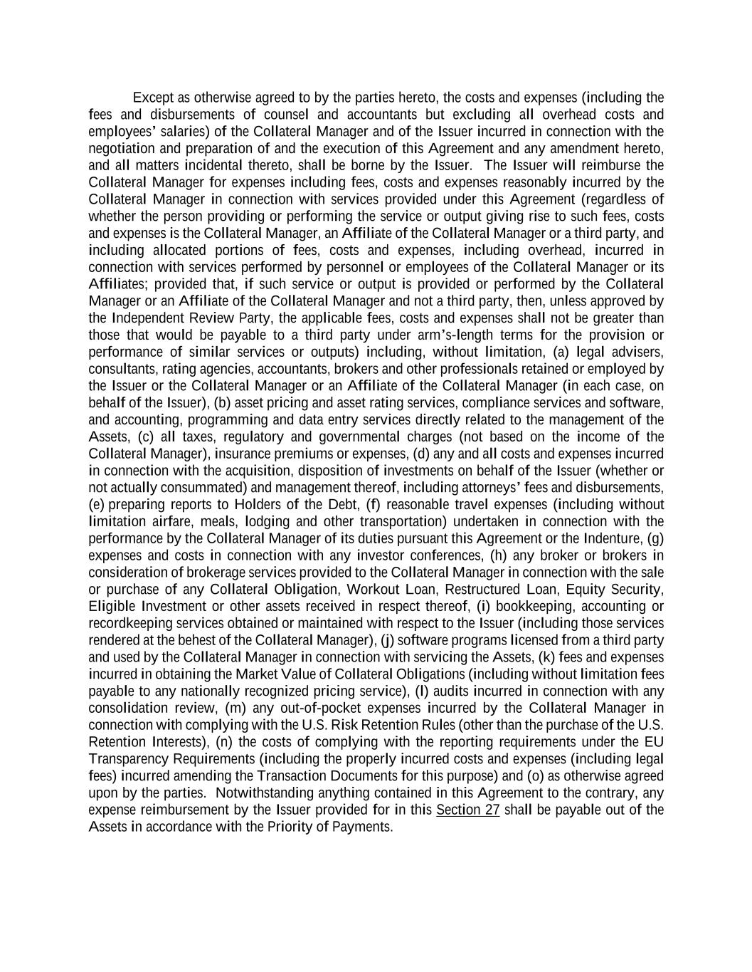 Except as otherwise agreed to by the parties hereto, the costs and expenses (including the fees and disbursements of counsel and accountants but excluding all overhead costs and employees’ salaries) of the Collateral Manager and of the Issuer incurred in connection with the negotiation and preparation of and the execution of this Agreement and any amendment hereto, and all matters incidental thereto, shall be borne by the Issuer. The Issuer will reimburse the Collateral Manager for expenses including fees, costs and expenses reasonably incurred by the Collateral Manager in connection with services provided under this Agreement (regardless of whether the person providing or performing the service or output giving rise to such fees, costs and expenses is the Collateral Manager, an Affiliate of the Collateral Manager or a third party, and including allocated portions of fees, costs and expenses, including overhead, incurred in connection with services performed by personnel or employees of the Collateral Manager or its Affiliates; provided that, if such service or output is provided or performed by the Collateral Manager or an Affiliate of the Collateral Manager and not a third party, then, unless approved by the Independent Review Party, the applicable fees, costs and expenses shall not be greater than those that would be payable to a third party under arm’s-length terms for the provision or performance of similar services or outputs) including, without limitation, (a) legal advisers, consultants, rating agencies, accountants, brokers and other professionals retained or employed by the Issuer or the Collateral Manager or an Affiliate of the Collateral Manager (in each case, on behalf of the Issuer), (b) asset pricing and asset rating services, compliance services and software, and accounting, programming and data entry services directly related to the management of the Assets, (c) all taxes, regulatory and governmental charges (not based on the income of the Collateral Manager), insurance premiums or expenses, (d) any and all costs and expenses incurred in connection with the acquisition, disposition of investments on behalf of the Issuer (whether or not actually consummated) and management thereof, including attorneys’ fees and disbursements, (e) preparing reports to Holders of the Debt, (f) reasonable travel expenses (including without limitation airfare, meals, lodging and other transportation) undertaken in connection with the performance by the Collateral Manager of its duties pursuant this Agreement or the Indenture, (g) expenses and costs in connection with any investor conferences, (h) any broker or brokers in consideration of brokerage services provided to the Collateral Manager in connection with the sale or purchase of any Collateral Obligation, Workout Loan, Restructured Loan, Equity Security, Eligible Investment or other assets received in respect thereof, (i) bookkeeping, accounting or recordkeeping services obtained or maintained with respect to the Issuer (including those services rendered at the behest of the Collateral Manager), (j) software programs licensed from a third party and used by the Collateral Manager in connection with servicing the Assets, (k) fees and expenses incurred in obtaining the Market Value of Collateral Obligations (including without limitation fees payable to any nationally recognized pricing service), (l) audits incurred in connection with any consolidation review, (m) any out-of-pocket expenses incurred by the Collateral Manager in connection with complying with the U.S. Risk Retention Rules (other than the purchase of the U.S. Retention Interests), (n) the costs of complying with the reporting requirements under the EU Transparency Requirements (including the properly incurred costs and expenses (including legal fees) incurred amending the Transaction Documents for this purpose) and (o) as otherwise agreed upon by the parties. Notwithstanding anything contained in this Agreement to the contrary, any expense reimbursement by the Issuer provided for in this Section 27 shall be payable out of the Assets in accordance with the Priority of Payments.