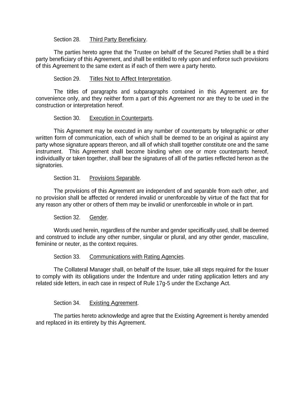Section 28. Third Party Beneficiary. The parties hereto agree that the Trustee on behalf of the Secured Parties shall be a third party beneficiary of this Agreement, and shall be entitled to rely upon and enforce such provisions of this Agreement to the same extent as if each of them were a party hereto. Section 29. Titles Not to Affect Interpretation. The titles of paragraphs and subparagraphs contained in this Agreement are for convenience only, and they neither form a part of this Agreement nor are they to be used in the construction or interpretation hereof. Section 30. Execution in Counterparts. This Agreement may be executed in any number of counterparts by telegraphic or other written form of communication, each of which shall be deemed to be an original as against any party whose signature appears thereon, and all of which shall together constitute one and the same instrument. This Agreement shall become binding when one or more counterparts hereof, individually or taken together, shall bear the signatures of all of the parties reflected hereon as the signatories. Section 31. Provisions Separable. The provisions of this Agreement are independent of and separable from each other, and no provision shall be affected or rendered invalid or unenforceable by virtue of the fact that for any reason any other or others of them may be invalid or unenforceable in whole or in part. Section 32. Gender. Words used herein, regardless of the number and gender specifically used, shall be deemed and construed to include any other number, singular or plural, and any other gender, masculine, feminine or neuter, as the context requires. Section 33. Communications with Rating Agencies. The Collateral Manager shall, on behalf of the Issuer, take all steps required for the Issuer to comply with its obligations under the Indenture and under rating application letters and any related side letters, in each case in respect of Rule 17g-5 under the Exchange Act. Section 34. Existing Agreement. The parties hereto acknowledge and agree that the Existing Agreement is hereby amended and replaced in its entirety by this Agreement.