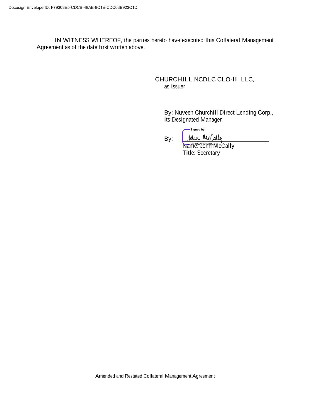 Amended and Restated Collateral Management Agreement IN WITNESS WHEREOF, the parties hereto have executed this Collateral Management Agreement as of the date first written above. CHURCHILL NCDLC CLO-II, LLC, as Issuer By: Nuveen Churchill Direct Lending Corp., its Designated Manager By: Name: John McCally Title: Secretary Docusign Envelope ID: F79303E5-CDCB-48AB-8C1E-CDC03B923C1D
