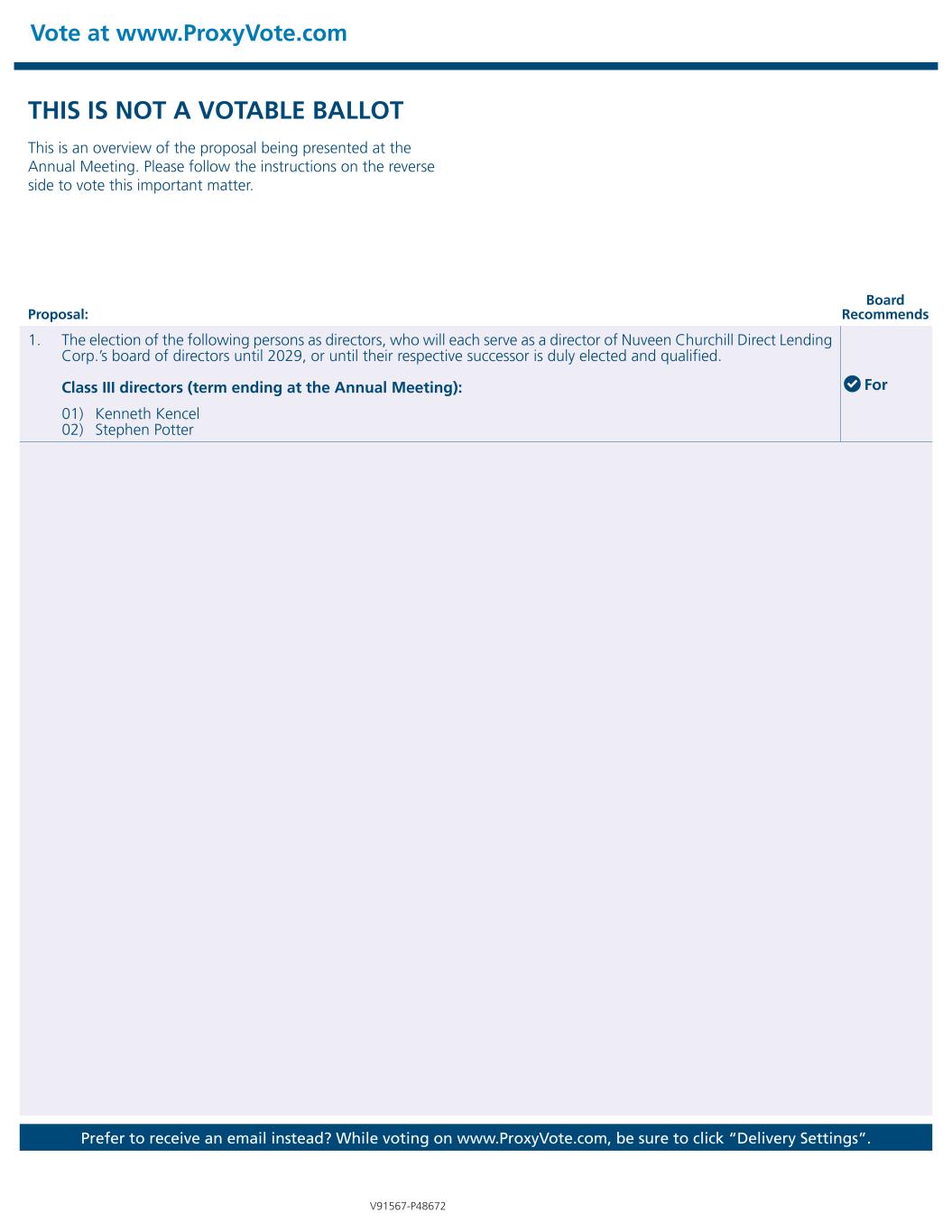 Vote at www.ProxyVote.com Prefer to receive an email instead? While voting on www.ProxyVote.com, be sure to click “Delivery Settings”. Proposal: Board Recommends V91567-P48672 THIS IS NOT A VOTABLE BALLOT This is an overview of the proposal being presented at the Annual Meeting. Please follow the instructions on the reverse side to vote this important matter. 1. The election of the following persons as directors, who will each serve as a director of Nuveen Churchill Direct Lending Corp.’s board of directors until 2029, or until their respective successor is duly elected and qualified. Class III directors (term ending at the Annual Meeting): For 01) Kenneth Kencel 02) Stephen Potter