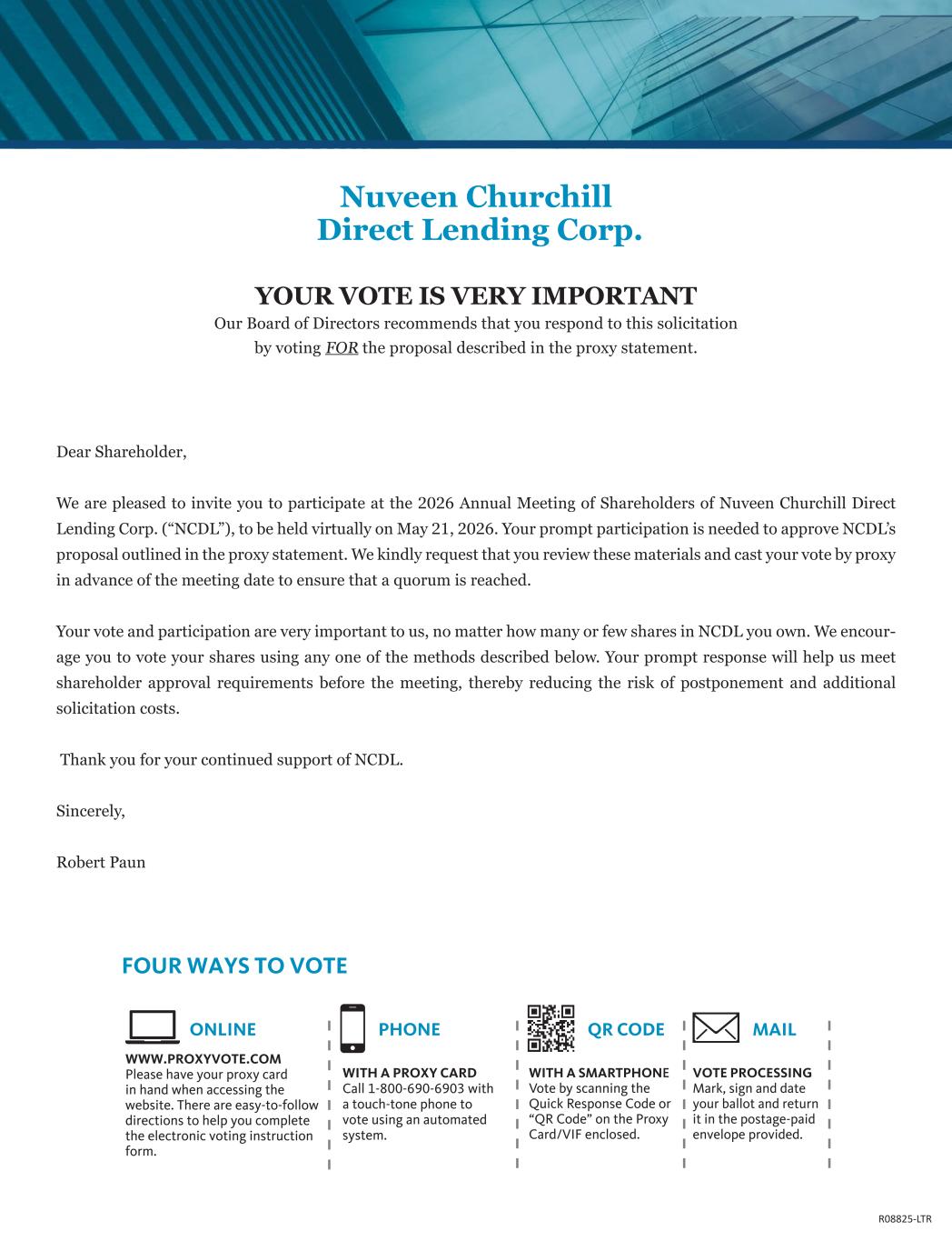 R08825-LTR Dear Shareholder, We are pleased to invite you to participate at the 2026 Annual Meeting of Shareholders of Nuveen Churchill Direct Lending Corp. (“NCDL”), to be held virtually on May 21, 2026. Your prompt participation is needed to approve NCDL’s proposal outlined in the proxy statement. We kindly request that you review these materials and cast your vote by proxy in advance of the meeting date to ensure that a quorum is reached. Your vote and participation are very important to us, no matter how many or few shares in NCDL you own. We encour- age you to vote your shares using any one of the methods described below. Your prompt response will help us meet shareholder approval requirements before the meeting, thereby reducing the risk of postponement and additional solicitation costs. Thank you for your continued support of NCDL. Sincerely, Robert Paun YOUR VOTE IS VERY IMPORTANT Our Board of Directors recommends that you respond to this solicitation by voting FOR the proposal described in the proxy statement. Nuveen Churchill Direct Lending Corp. FOUR WAYS TO VOTE WWW.PROXYVOTE.COM Please have your proxy card in hand when accessing the website. There are easy-to-follow directions to help you complete the electronic voting instruction form. ONLINE VOTE PROCESSING Mark, sign and date your ballot and return it in the postage-paid envelope provided. MAILPHONE WITH A PROXY CARD Call 1-800-690-6903 with a touch-tone phone to vote using an automated system. WITH A SMARTPHONE Vote by scanning the Quick Response Code or “QR Code” on the Proxy Card/VIF enclosed. QR CODE