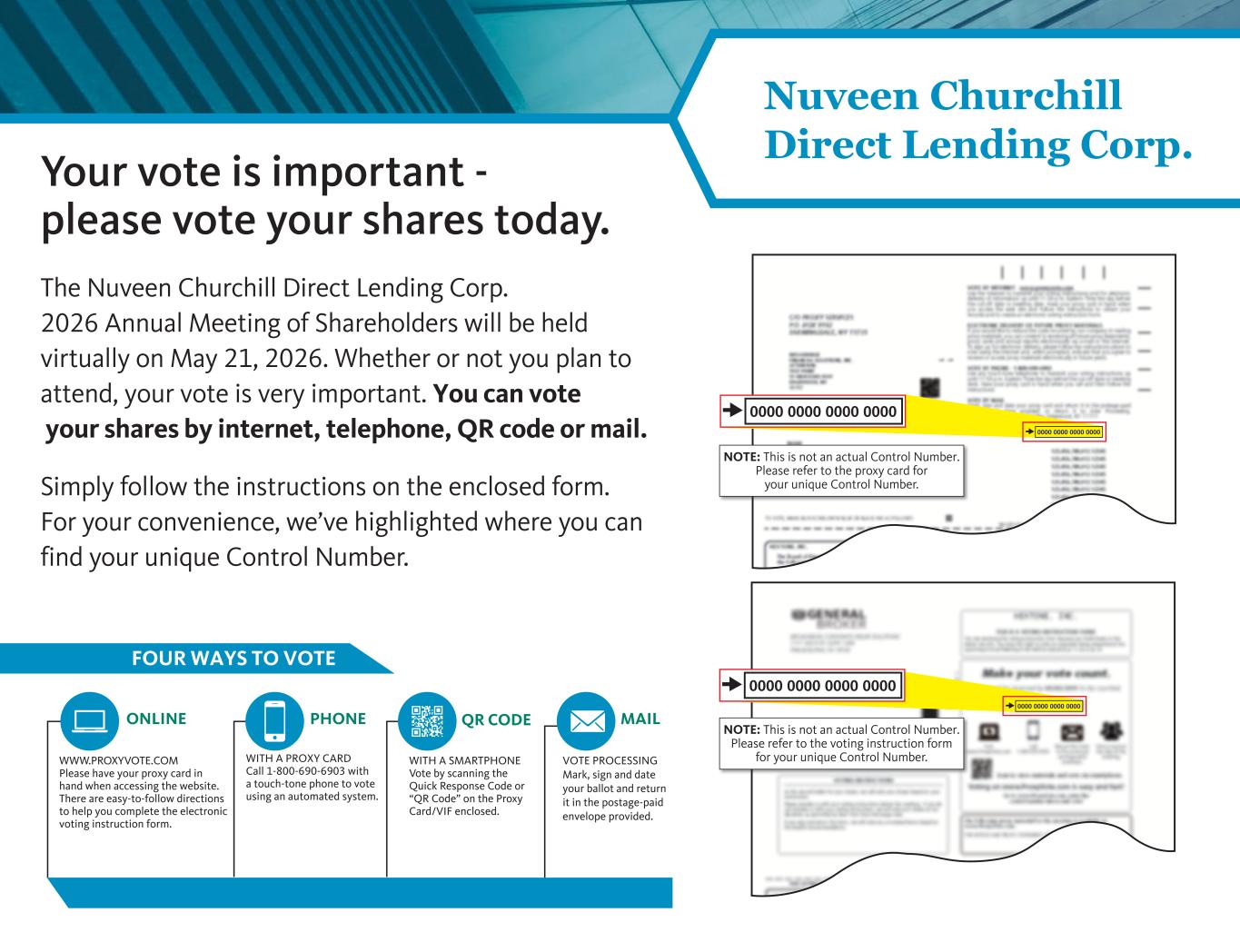 Your vote is important - please vote your shares today. The Nuveen Churchill Direct Lending Corp. 2026 Annual Meeting of Shareholders will be held virtually on May 21, 2026. Whether or not you plan to attend, your vote is very important. You can vote your shares by internet, telephone, QR code or mail. Simply follow the instructions on the enclosed form. For your convenience, we’ve highlighted where you can find your unique Control Number. 0000 0000 0000 0000 0000 0000 0000 0000 0000 0000 0000 0000 0000 0000 0000 0000 NOTE: This is not an actual Control Number. Please refer to the voting instruction form for your unique Control Number. NOTE: This is not an actual Control Number. Please refer to the proxy card for your unique Control Number. WWW.PROXYVOTE.COM Please have your proxy card in hand when accessing the website. There are easy-to-follow directions to help you complete the electronic voting instruction form. ONLINE VOTE PROCESSING Mark, sign and date your ballot and return it in the postage-paid envelope provided. MAILPHONE WITH A PROXY CARD Call 1-800-690-6903 with a touch-tone phone to vote using an automated system. WITH A SMARTPHONE Vote by scanning the Quick Response Code or “QR Code” on the Proxy Card/VIF enclosed. QR CODE FOUR WAYS TO VOTE Nuveen Churchill Direct Lending Corp.
